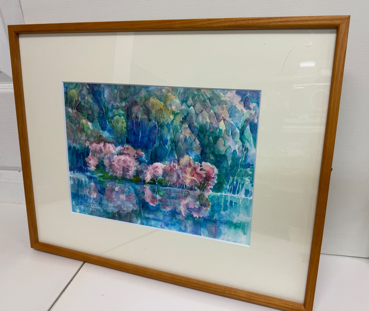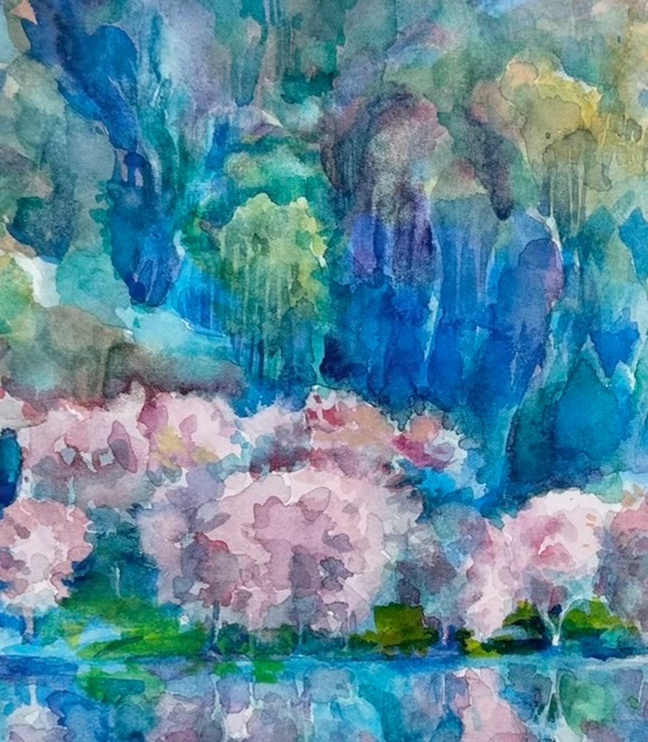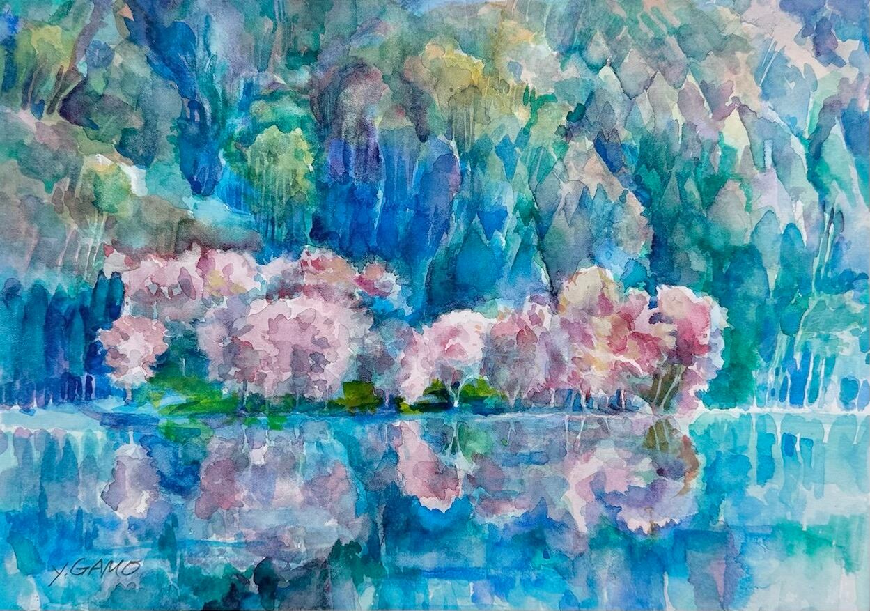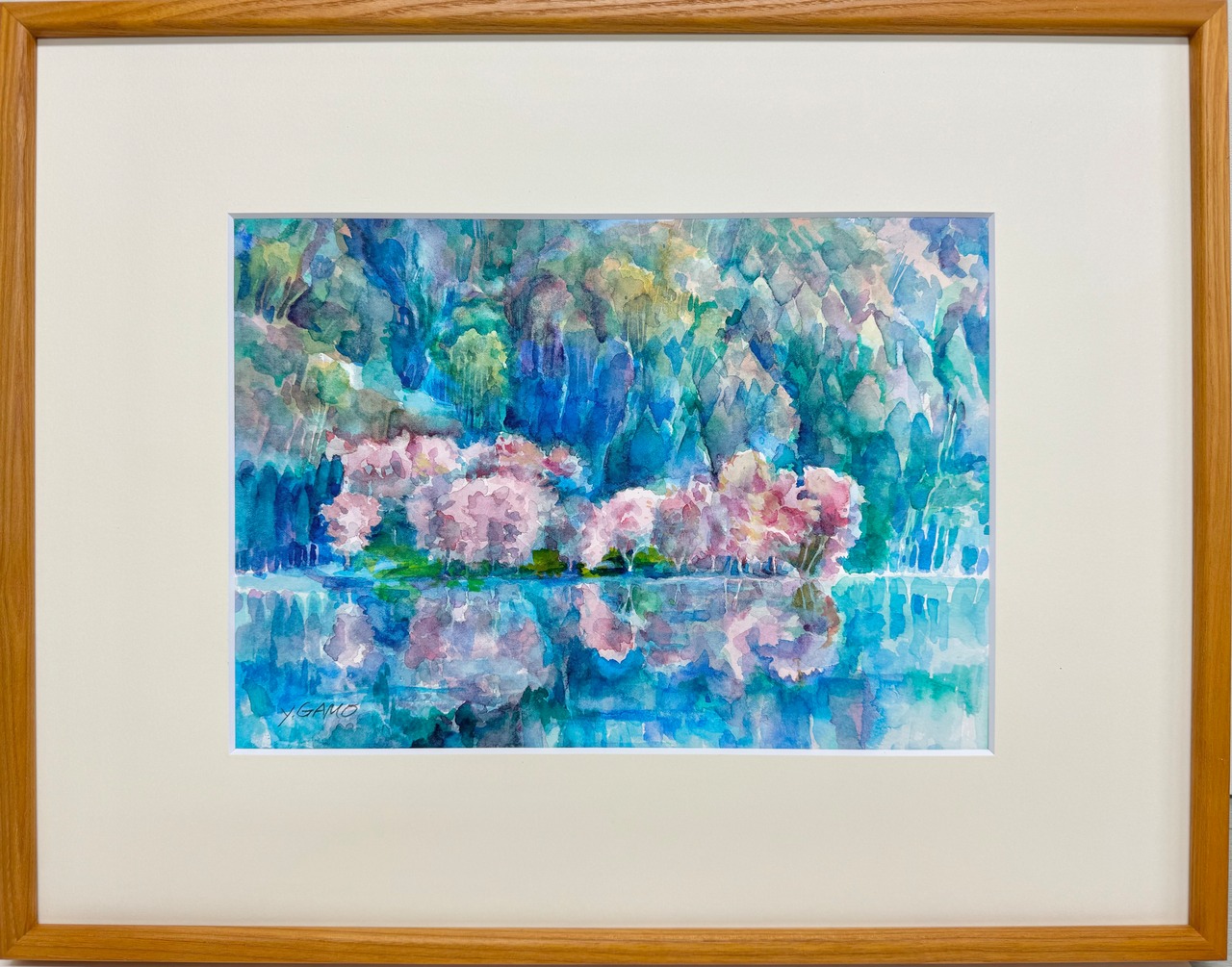朝5時前、柔らかい朝日が当たる時間帯がとても幻想的な風景となり、多くのカメラマンが訪れます。清らかな湖面に映り込む桜と山々は静寂な雰囲気を感じさせ、春の微妙な色彩を感じながら心癒される美しい風景画の制作となりました。