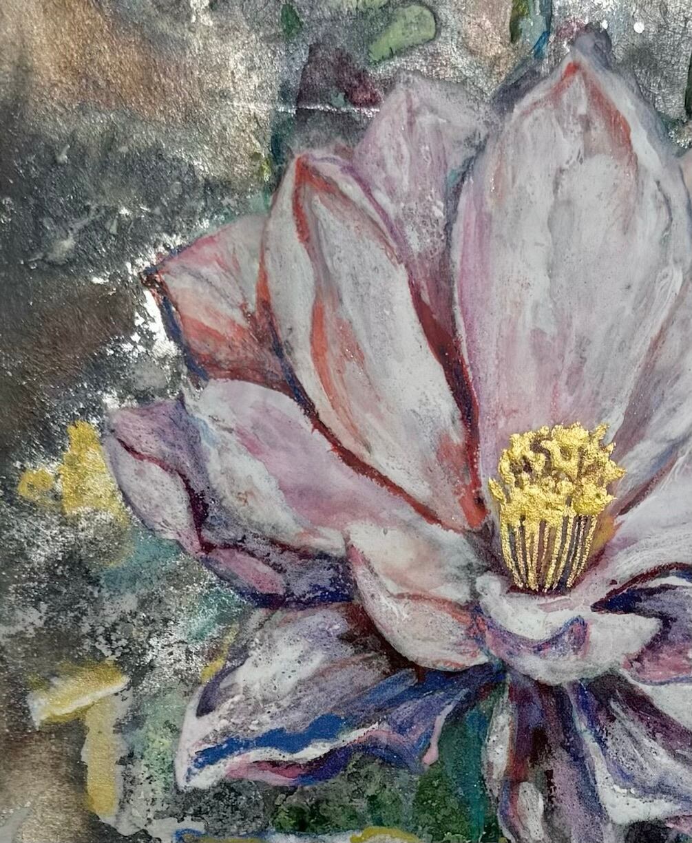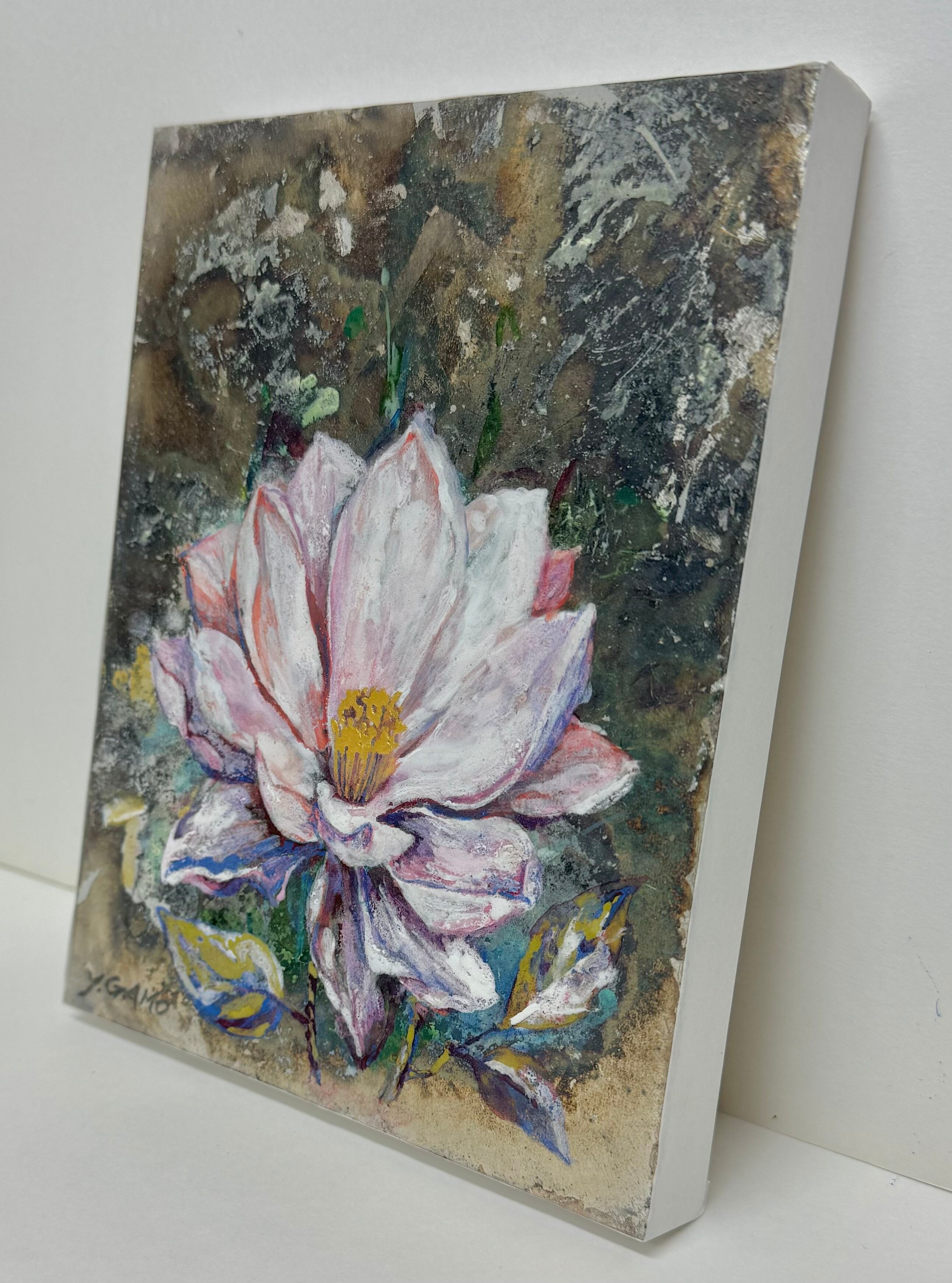 『マグノリア』は、春の訪れを華やかに告げる大輪の花を描いた特別な作品です。その優美な姿と鮮やかな白い花弁が特徴で、見る人の心を引き込みます。私はこの作品を通じて、マグノリアの持つ華やかさと生命の力強さを表現しています。暖かな日差しの中で咲き誇るマグノリアの美しさを、皆様の日常に彩りを添える一瞬として感じていただければ幸いです。 また、和紙の独特な質感を活かし、風合い豊かな銀箔焼きという日本画の技法で仕上げました。